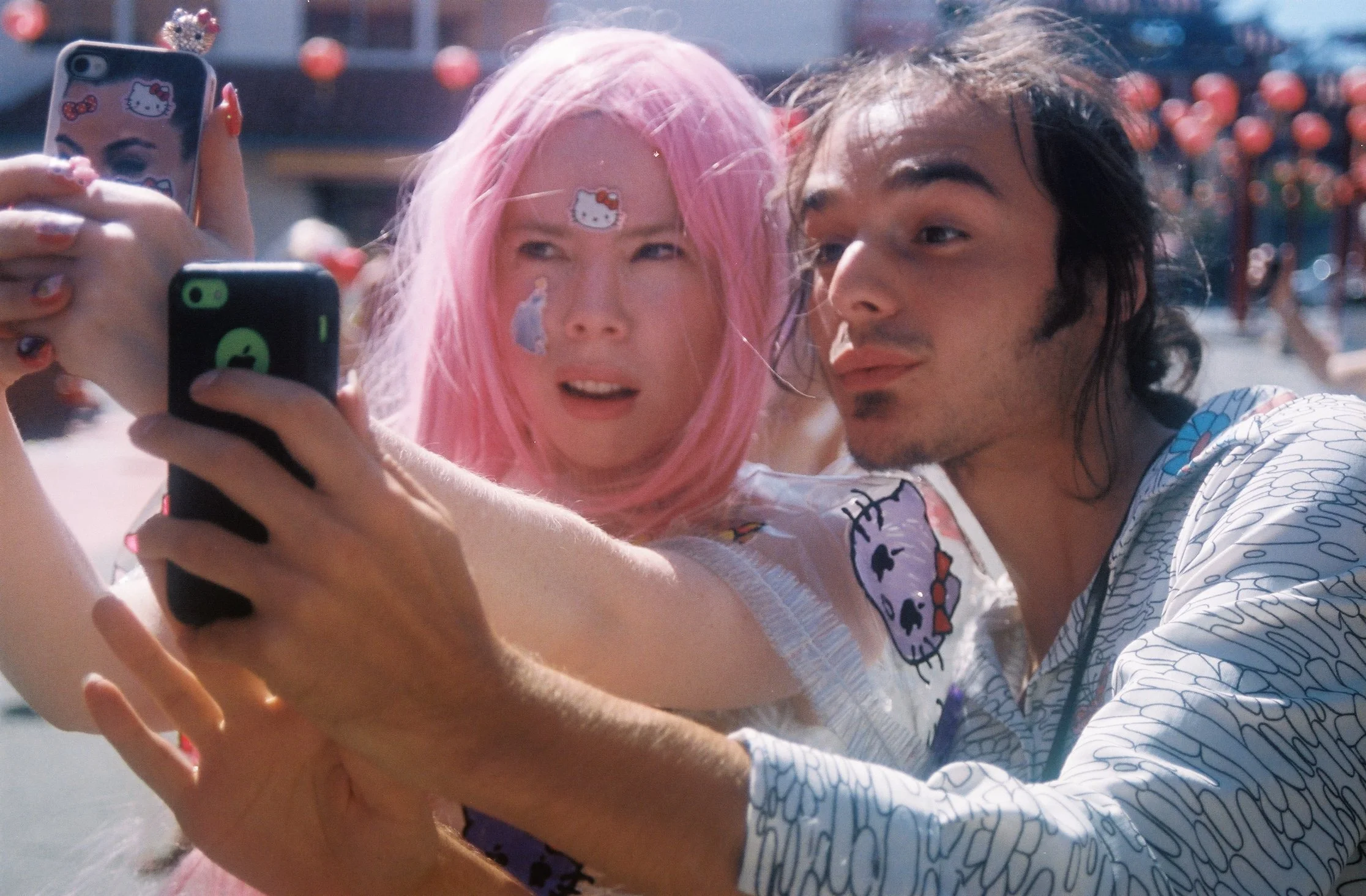 “[Durbin uses] selfies [to] reclaim the often mocked and ‘feminine’ performance for the camera, as art, as a potentially empowering practice. [The Hello Selfie performance takes place] in LA’s Chinatown, with a group of women taking selfies for an hour straight. The women are decked out in Hello Kitty and glitter and unabashedly photograph their near-naked bodies. The video [documentation of the performance] also captures the reactions of the public filming pedestrians mocking or joyfully participating in the spectacle. In its position as irl performance, as well as a digital video, the work is able to document the way people objectify, or learn about objectification, in the process of spectatorship.” -Katie Rosenthal, The Hundreds, 2015